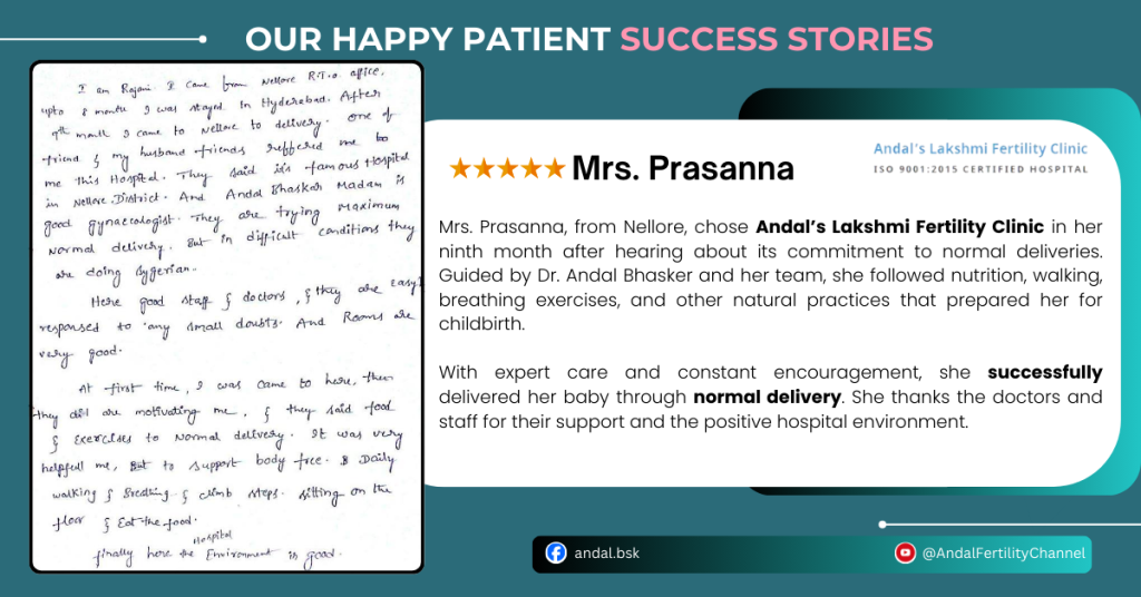 She expressed gratitude to Dr. Andal Bhasker and the entire team for their constant encouragement, excellent care, and for creating a comfortable environment for her delivery journey.